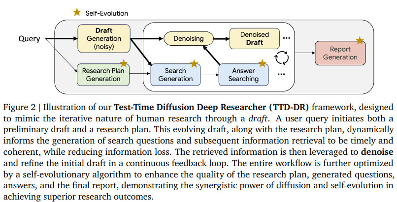 1)提出“测试时扩散”范式,把长篇研究报告生成视为“草稿驱动的去噪”过程;