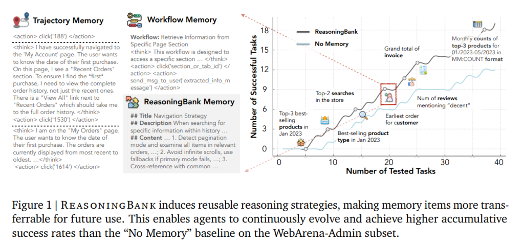 1)ReasoningBank:把智能体在交互轨迹中的“思考与行动”蒸馏为结构化的“策略级记忆项”(title/description/content 三段式),既保留成功经验中的有效套路,也显式吸纳失败经历中的“防错启示/反事实线索”。与只存原始轨迹或只存成功流程的以往方法不同,它强调提炼可迁移的“高层推理模式”。