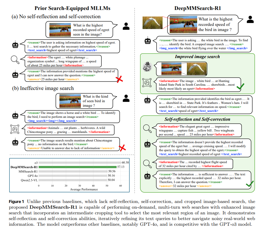 现实应用中的多模态大模型(MLLM)在知识密集与信息检索型视觉问答任务上常受限于静态训练语料与长尾知识分布,难以及时获取最新事实与开放世界知识;传统RAG与“搜索代理”方案又常存在检索管线僵硬、查询构造欠佳、过度检索与噪声注入等问题。论文DeepMMSearch-R1: Empowering Multimodal LLMs in Multimodal Web Search提出的 DeepMMSearch-R1 针对这些痛点,强调“按需、多轮”的网页搜索、基于检索反馈的自反思/自纠错,以及以“裁剪—检索”协同的图像检索,从而在真实网络环境中更稳健地完成多模态信息寻址与推理。