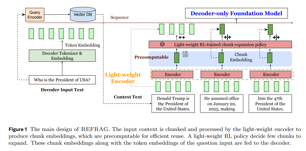 论文REFRAG: Rethinking RAG based Decoding介绍了一种名为 REFRAG (REpresentation For RAG) 的新型高效解码框架,专为检索增强生成 (RAG) 应用设计。简单来说,REFRAG 的目标是解决大型语言模型 (LLMs) 在使用 RAG 处理大量外部知识时遇到的速度慢和内存占用大的问题。在 RAG 应用中,LLMs 会利用检索到的外部信息来增强回答。然而,当这些检索到的信息(即上下文)很长时,会导致系统显著的延迟和巨大的内存需求。