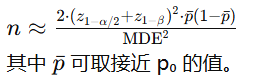 - 需要输入:基线转化率 p₀、期望最小可检出差异 MDE、显著性水平 α(常 0.05)、检验功效 1-β(常 0.8)。