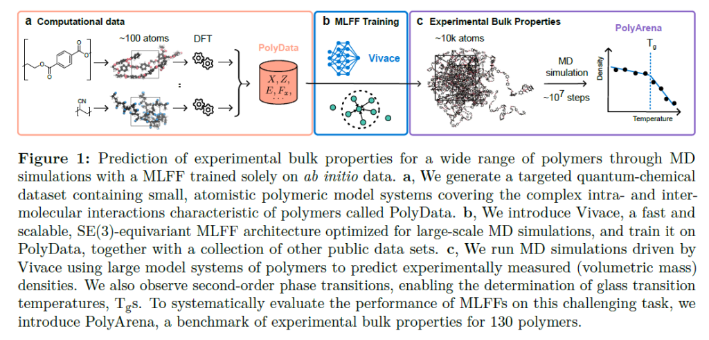 1)提出 Vivace:一种面向聚合物的快速、可扩展 MLFF,能在原子尺度分辨率下稳定开展大体系分子动力学(MD)并连接到宏观体密度与 Tg。
