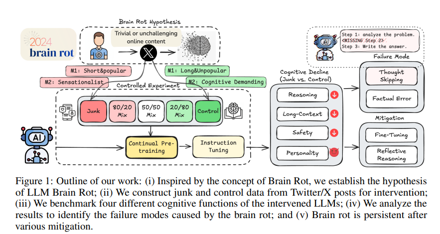 这是一篇将“人类脑腐化”映射至 LLM 的数据质量-能力因果研究:碎片化、吸睛但低信息的内容会在持续预训练中“腐蚀”模型的思考链条与长程记忆,且很难被事后微调完全补救,因此数据策展=训练期安全。