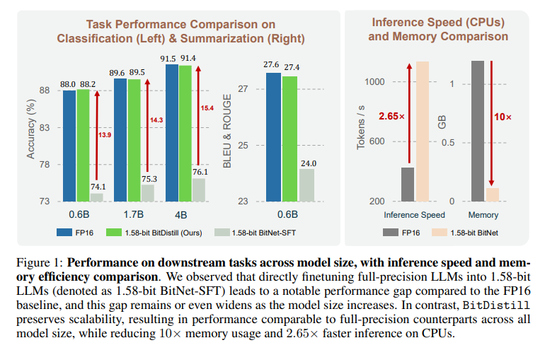 BitDistill 给出一条“轻量、稳健、可扩展”的道路:用最小的额外训练(SubLN+少量继续预训练+双重蒸馏)把现成 FP16 LLM 压到 1.58-bit,而且不牺牲任务精度,还能在 CPU/边缘端获得显著吞吐与内存优势。对于追求“任务专用 + 端侧高效”的应用团队,这是当前工程上性价比极高的方案之一。