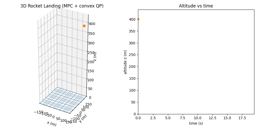如果把模型从 1D 扩展到 2D/3D,推力变成向量 T⃗_k,推力方向、偏转角等约束可以写成二阶锥约束(例如 ‖T⊥‖ ≤ tan(θ_max)·T_z),整个问题自然升级为二阶锥规划(SOCP)。这就是很多火箭回收论文里提到的“基于 SOCP 的轨迹优化”的来历。