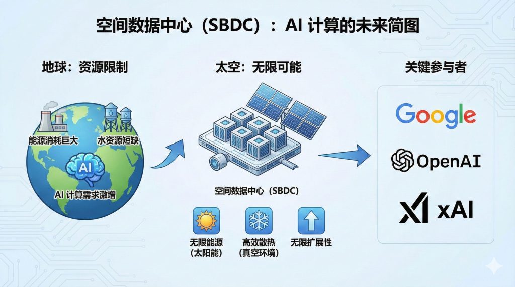 Google、OpenAI和xAI等科技巨头正在推进空间数据中心(Space-Based Data Centers, SBDCs)和空基AI计算方面的工作,主要是为了应对AI对地球资源(尤其是能源和水)日益增长的巨大需求,并寻求实现计算基础设施的无限扩展。