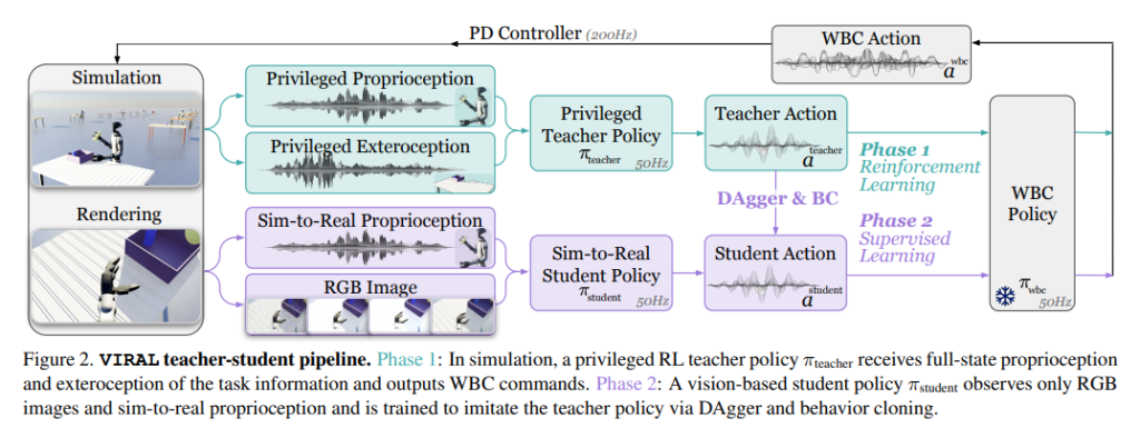 - 学生策略:只看真实机器人可获得的输入(RGB 图像与自身传感器信息),通过模仿蒸馏学会复现教师的行为,然后直接上真机。